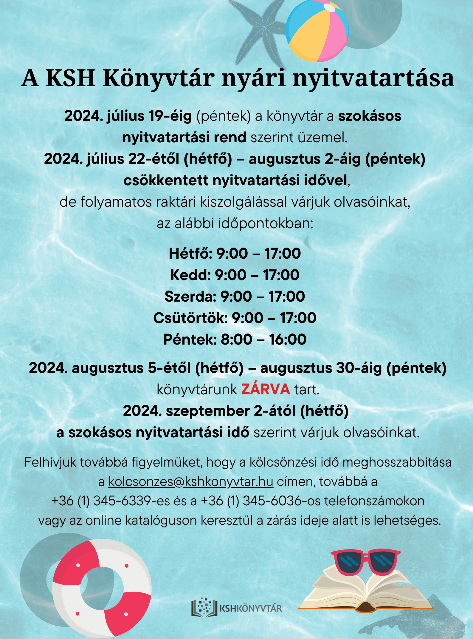 2024. július 22-étől (hétfő) – augusztus 2-áig (péntek) csökkentett nyitvatartási idővel, de folyamatos raktári kiszolgálással várjuk olvasóinkat, az alábbi időpontokban: