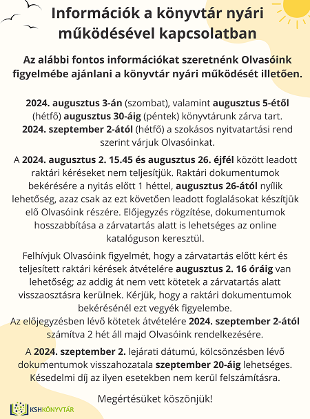 2024. augusztus 3-án (szombat), valamint augusztus 5-étől (hétfő) augusztus 30-áig (péntek) könyvtárunk zárva tart. 2024. szeptember 2-ától (hétfő) a szokásos nyitvatartási rend szerint várjuk Olvasóinkat. A 2024. augusztus 2. 15.45 és augusztus 26. éjfél között leadott raktári kéréseket nem teljesítjük. Raktári dokumentumok bekérésére a nyitás előtt 1 héttel, augusztus 26-ától nyílik lehetőség, azaz csak az ezt követően leadott foglalásokat készítjük elő Olvasóink részére. Előjegyzés rögzítése, dokumentumok hosszabbítása a zárvatartás alatt is lehetséges az online katalóguson keresztül.