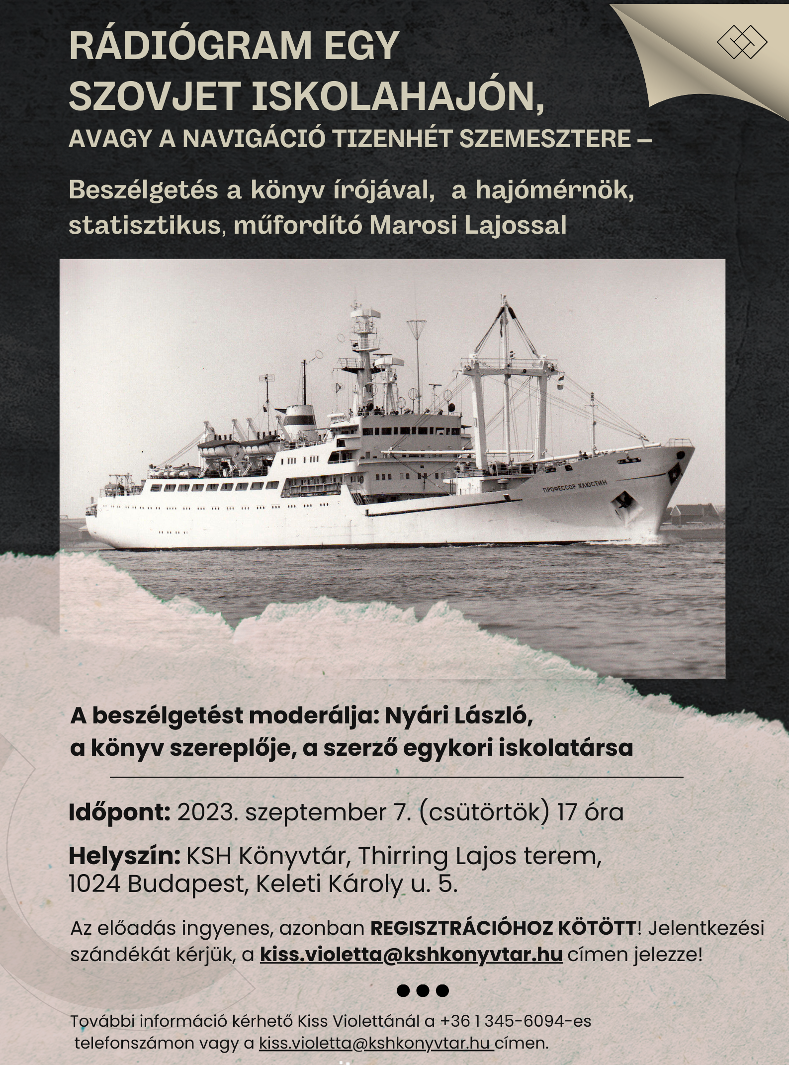 2023. szeptember 7-én (csütörtök) 17 órakor szeretettel várjuk az érdeklődőket a Rádiógram egy szovjet iskolahajón, avagy a navigáció tizenhét szemesztere című beszélgetőestünkre a könyv írójával, a hajómérnök, statisztikus, műfordító Marosi Lajossal. A beszélgetést moderálja: Nyári László, a könyv szereplője, a szerző egykori iskolatársa.