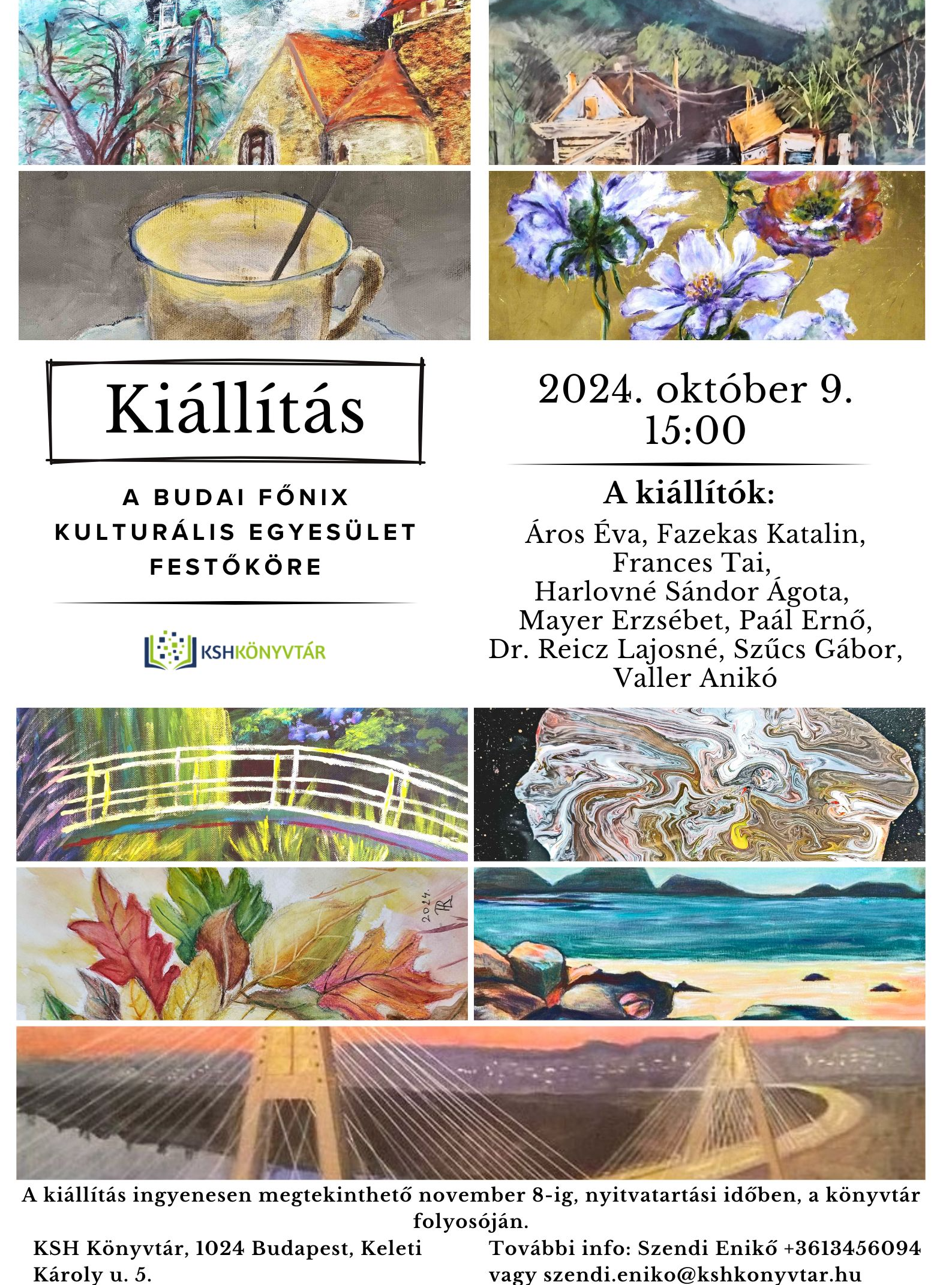 Sok szeretettel várjuk az érdeklődőket a Budai Főnix Kulturális Egyesület festőköre tagjainak kiállítás megnyitójára. A kiállítást Kálmán Rita, a KSH Könyvtár főigazgatója nyitja meg.