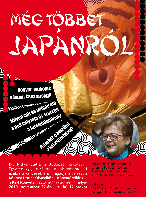 2019. november 27-én (szerda) 17 órától dr. Hidasi Judit, a Budapesti Gazdasági Egyetem egyetemi tanára tart előadást Japánról.