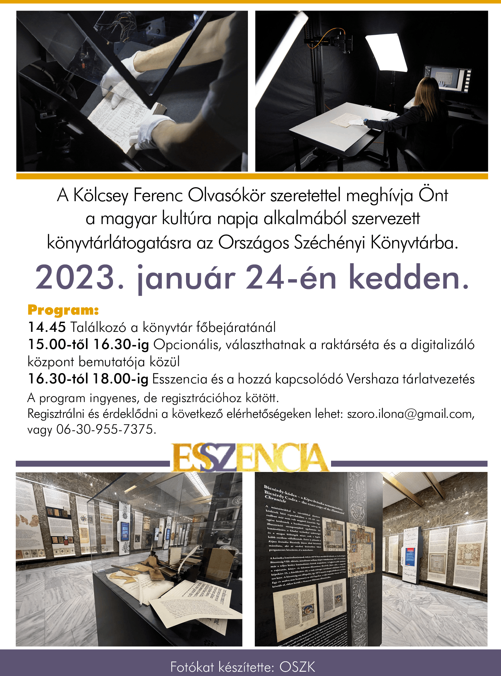 2023. január 24-én (kedden) szeretettel várja az érdeklődőket a Kölcsey Ferenc Olvasókör, a KSH Könyvtár és a Könyvtárellátó az Országos Széchényi Könyvtárba történő látogatásra a magyar kultúra napja alkalmából. A program ingyenes, de regisztrációhoz kötött. Regisztrálni a következő elérhetőségeken lehet: #SSS#c3pvcm8uaWxvbmFAZ21haWwuY29t#EEE#, 06-30-955-7375