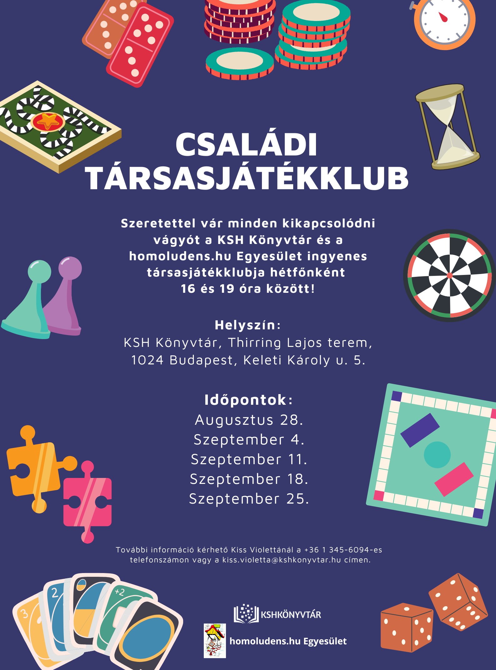 Augusztus végén és szeptemberben ismét várja az érdeklődő kicsiket és nagyokat a KSH Könyvtár és a homoludens.hu Egyesület közös rendezésű családi társasjátékklubja hétfőnként 16 és 19 óra között. Időpontok: augusztus 28., szeptember 4., 11., 18., 25. Helyszín: Thirring Lajos terem.
