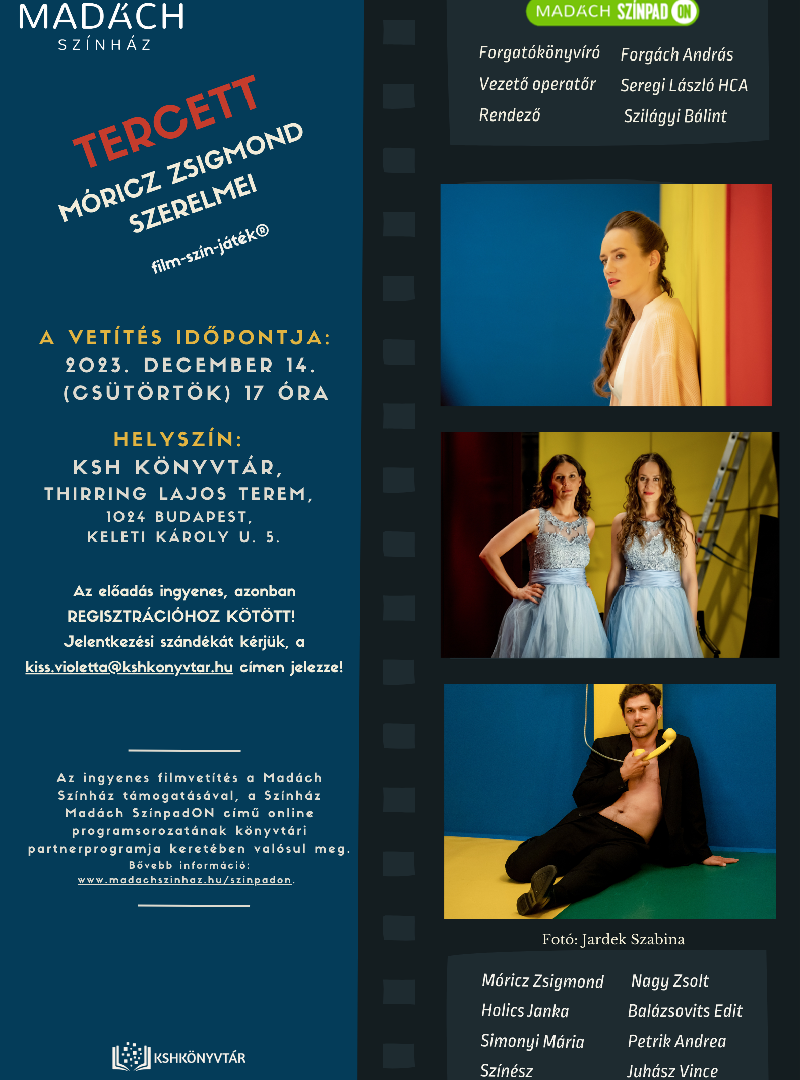 2023. december 14-én (kedd) 17 órától a Madách Színház Írók-Sorsok-Szerelmek című online irodalmi programsorozatának Tercett – Móricz Zsigmond szerelmei című film-szín-játékára várjuk a színház- és irodalomkedvelő érdeklődőket. A rendezvényen való részvétel ingyenes, azonban REGISZTRÁCIÓHOZ kötött! Jelentkezni a kiss.violetta@kshkonyvtar.hu címen lehet. Az ingyenes filmvetítés a Madách Színház támogatásával, a Színház Madách SzínpadON című online programsorozatának könyvtári partnerprogramja keretében valósul meg. Bővebb információ: www.madachszinhaz.hu/szinpadon. Helyszín: Thirring Lajos terem.