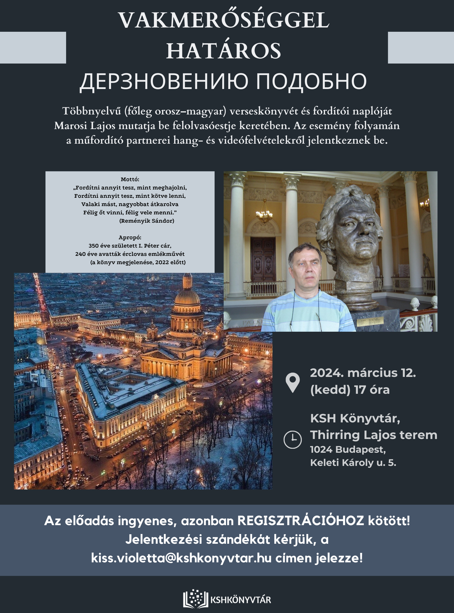 2024. március 12-én (kedd) 17 órától szeretettel várunk minden érdeklődőt Marosi Lajos műfordító felolvasóestjére, melynek során Vakmerőséggel határos című többnyelvű (főleg orosz–magyar) verseskönyvét és fordítói naplóját mutatja be. Az est folyamán a műfordító partnerei hang- és videófelvételekről jelentkeznek be.