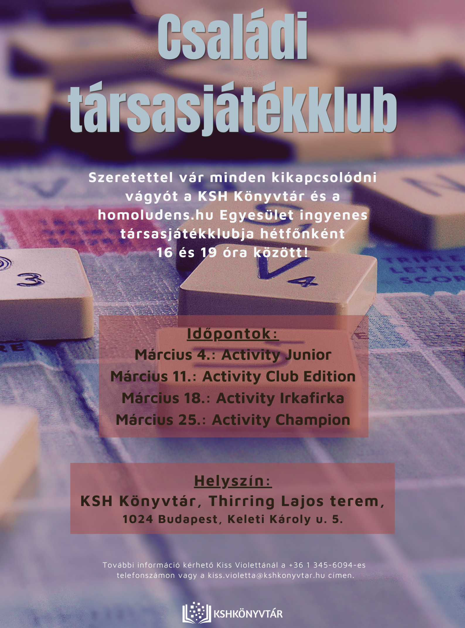 Márciusban ismét várja az érdeklődő kicsiket és nagyokat a KSH Könyvtár és a homoludens.hu Egyesület közös rendezésű családi társasjátékklubja hétfőnként 16 és 19 óra között. Időpontok: március 4., 11., 18., 25.