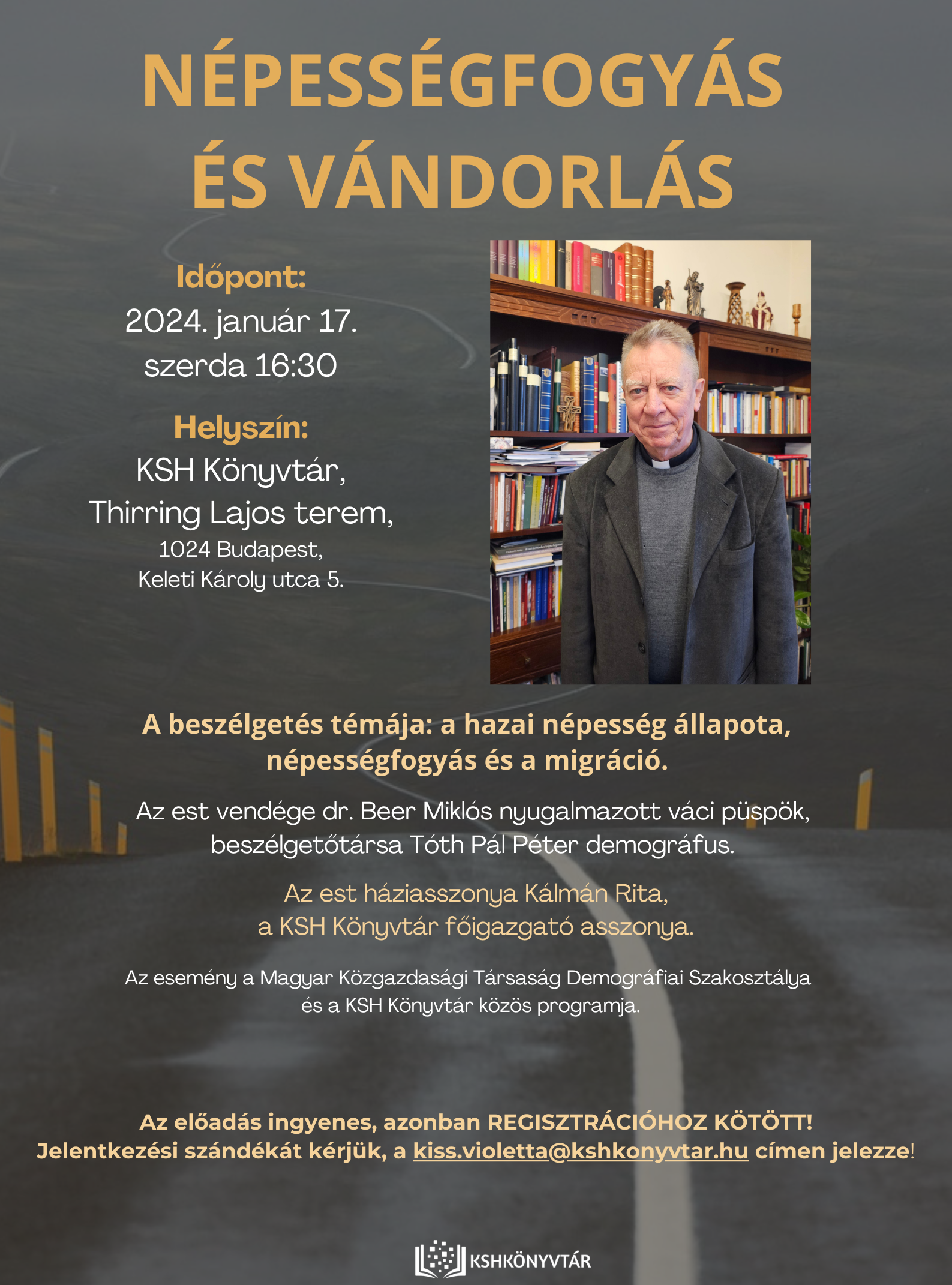 Szeretettel várunk minden érdeklődőt 2024. január 17-én (szerda) 16:30-tól a Népességfogyás és vándorlás című beszélgetőestünkre, ahol Dr. Beer Miklós nyugalmazott váci püspökkel Tóth Pál Péter demográfus beszélget majd a hazai népesség állapotáról, népességfogyásról és migrációról.