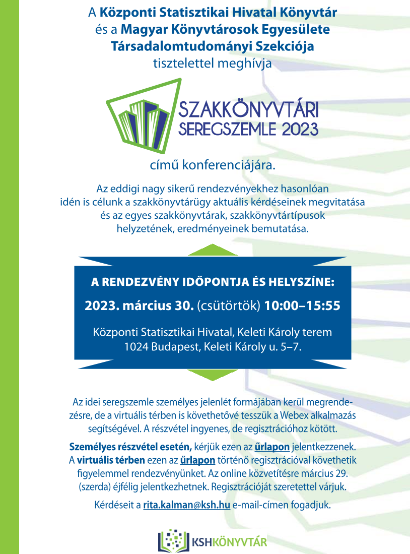 A Központi Statisztikai Hivatal Könyvtár és a Magyar Könyvtárosok Egyesülete Társadalomtudományi Szekciója tisztelettel meghívja Szakkönyvtári seregszemle 2023 című konferenciájára.