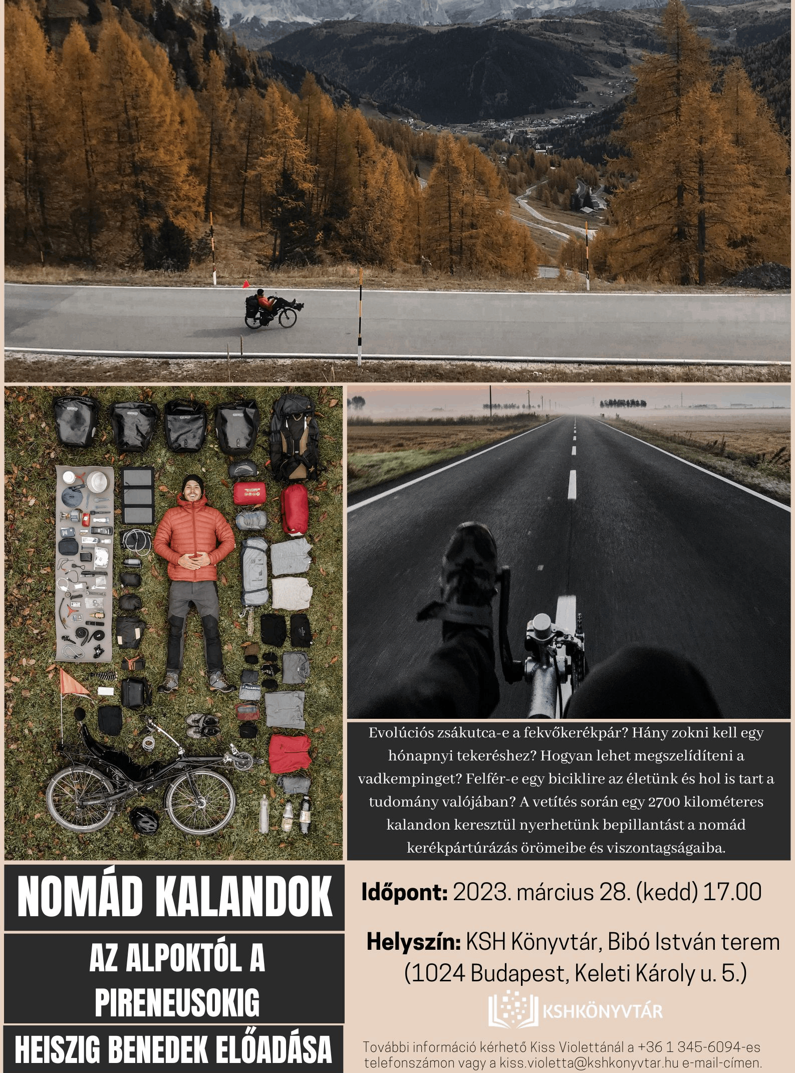 Sok szeretettel várjuk az érdeklődőket 2023. március 28-án kedden 17.00 órakor Heiszig Benedek nomád utazó és filmes freelancer Nomád kalandok. Az Alpoktól a Pireneusokig című előadásán. Az est folyamán Benedek mesél majd nekünk arról, hogy milyen kalandokban volt része fekve tekerős biciklijén Európát körbetekerve.