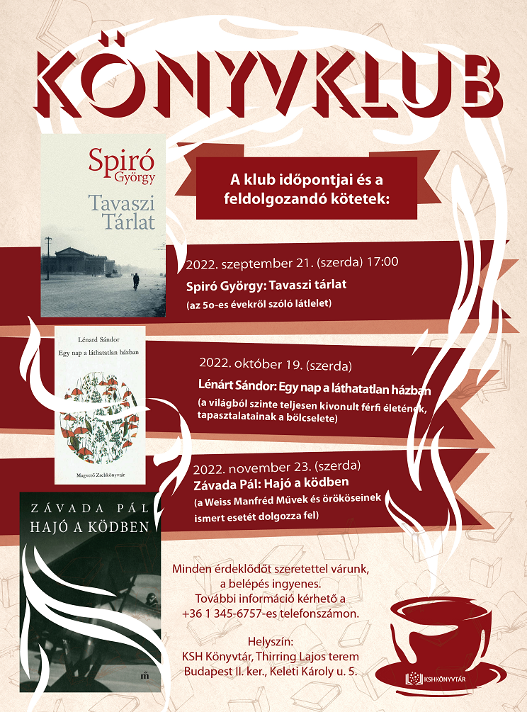 2022. október 19-én (szerdán) 17:00 órától sok szeretettel vár mindenkit a KSH Könyvtár könyvklubja, „...nekem tetszett, szeretném veletek megosztani...” címmel!