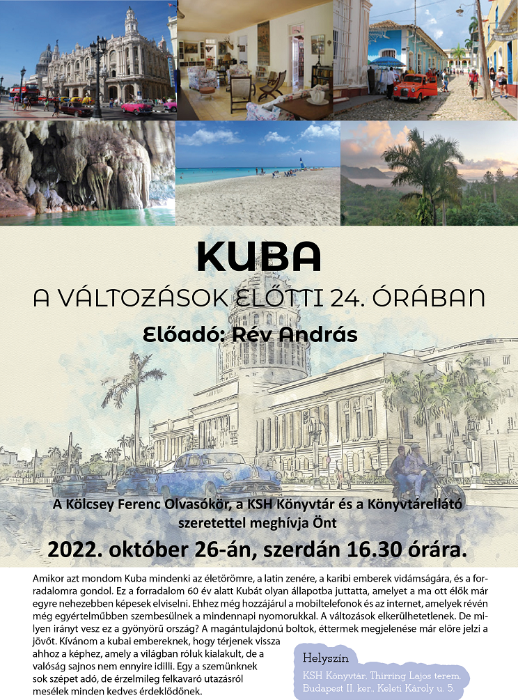 2022. október 26-án (szerdán) 16:30 órától szeretettel várja az érdeklődőket a Kölcsey Ferenc Olvasókör, a KSH Könyvtár és a Könyvtárellátó Kuba a változások előtti 24. órában című rendezvényére.
