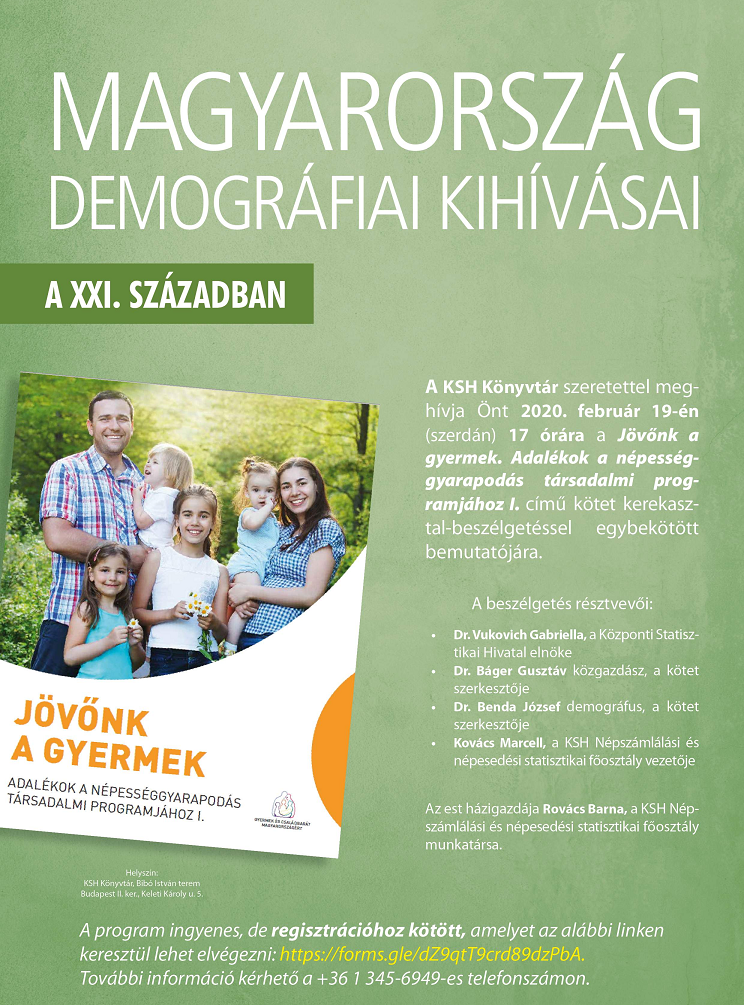 A KSH Könyvtár szeretettel meghívja Önt 2020. február 19-én (szerdán) 17 órára a Jövőnk a gyermek. Adalékok a népességgyarapodás társadalmi programjához I. című kötet kerekasztal-beszélgetéssel egybekötött bemutatójára.