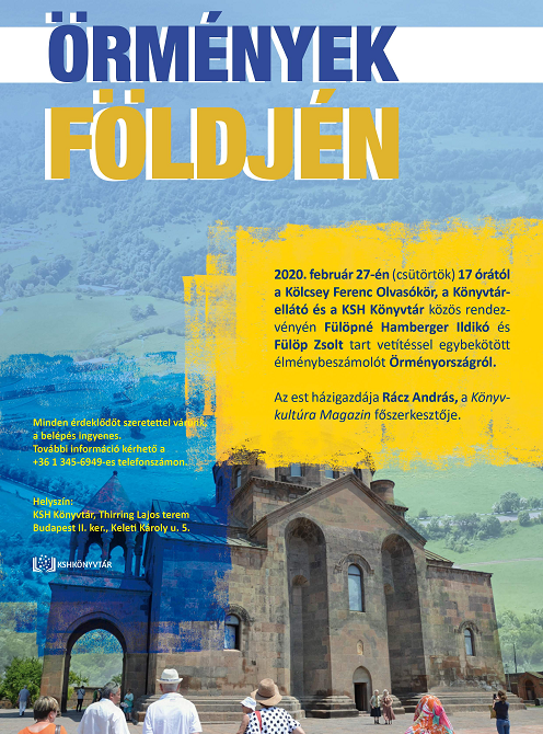 2020. február 27-én (csütörtök) 17 órától a Kölcsey Ferenc Olvasókör, a Könyvtárellátó és a KSH Könyvtár közös rendezvényén Fülöpné Hamberger Ildikó és Fülöp Zsolt tart vetítéssel egybekötött élménybeszámolót Örményországról.
