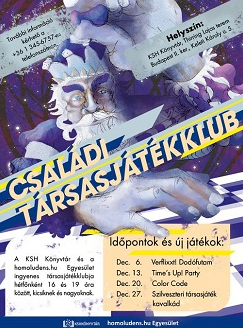 A KSH Könyvtár és a homolundens.hu Egyesület ingyenes társasjáték klubja hétfőnként 16 és 19 óra között, kicsiknek és nagyoknak.