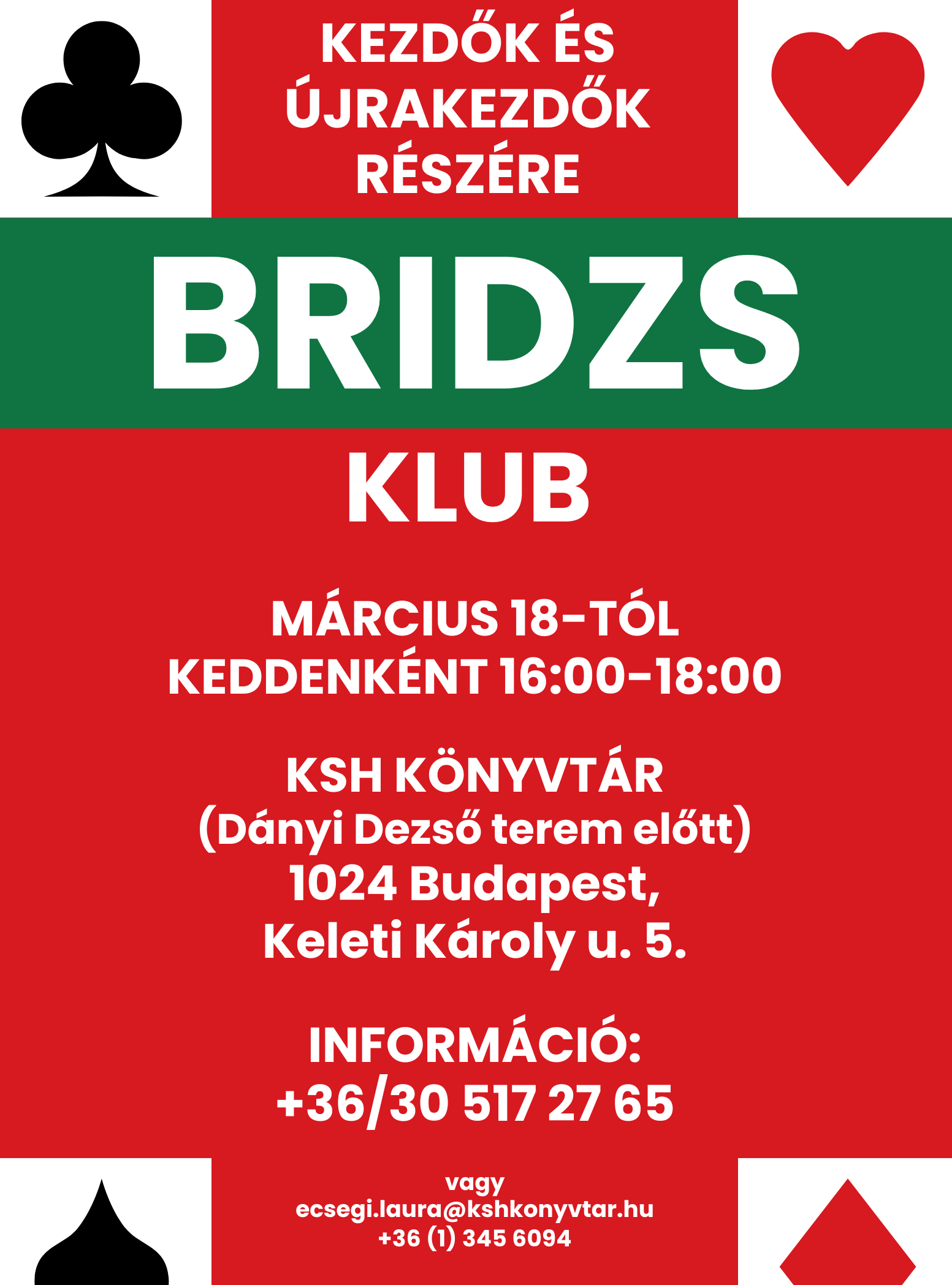 Március 18-tól indul a bridzs klub, minden keddenként 16 órától 18 óráig várjuk a kedves érdeklődőket!