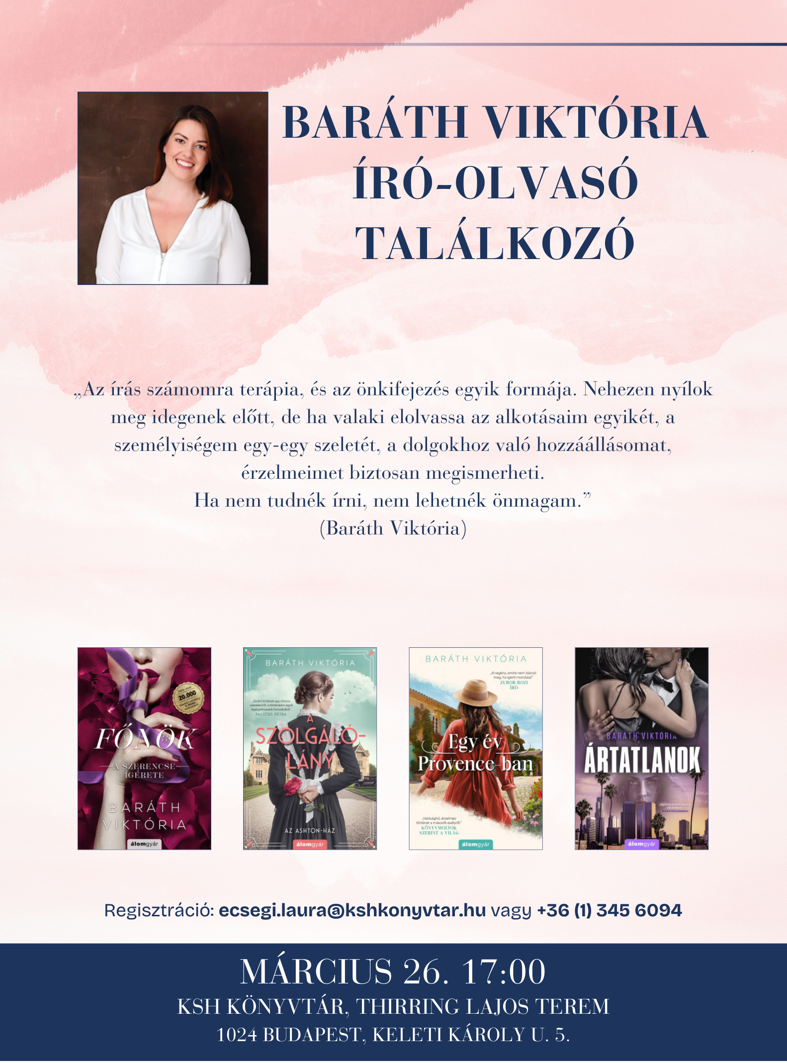 A KSH Könyvtár szeretettel várja az érdeklődőket Baráth Viktória író-olvasó találkozójára, amely 2025.03.26-án 17 órakor kerül megrendezésre.