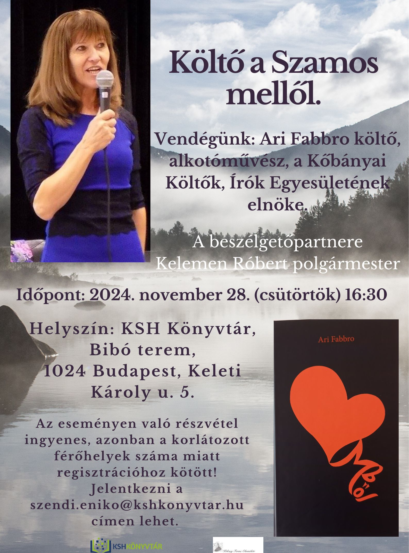 A Kölcsey Ferenc Olvasókör szervezésében: Költő a Szamos mellől. Vendégünk: Ari Fabbro költő, alkotóművész, a Kőbányai Költők, Írók Egyesületének elnöke. Az eseményen való részvétel ingyenes, azonban a korlátozott férőhelyek száma miatt REGISZTRÁCIÓHOZ kötött! Jelentkezni a #SSS#PGEgaHJlZj0ibWFpbHRvOnN6ZW5kaS5lbmlrb0Brc2hrb255dnRhci5odSI+c3plbmRpLmVuaWtvQGtzaGtvbnl2dGFyLmh1PC9hPg==#EEE# címen lehet.